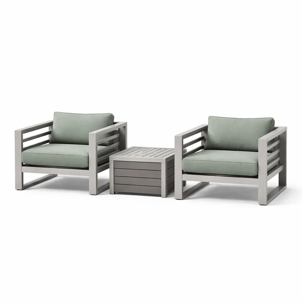 Ensemble de détente en aluminium gris avec fauteuils d extérieur et coussins verts
