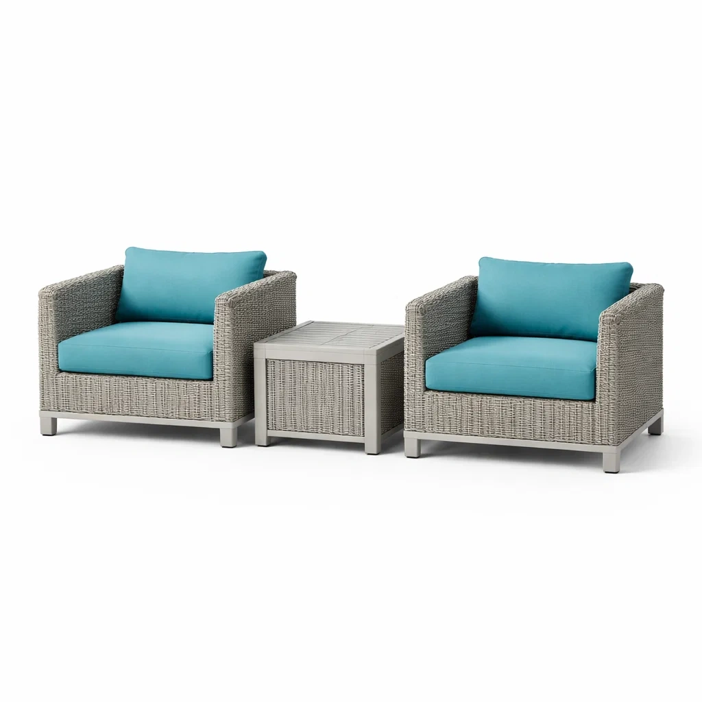Ensemble de détente en résine tressée avec fauteuils d extérieur et coussins turquoise