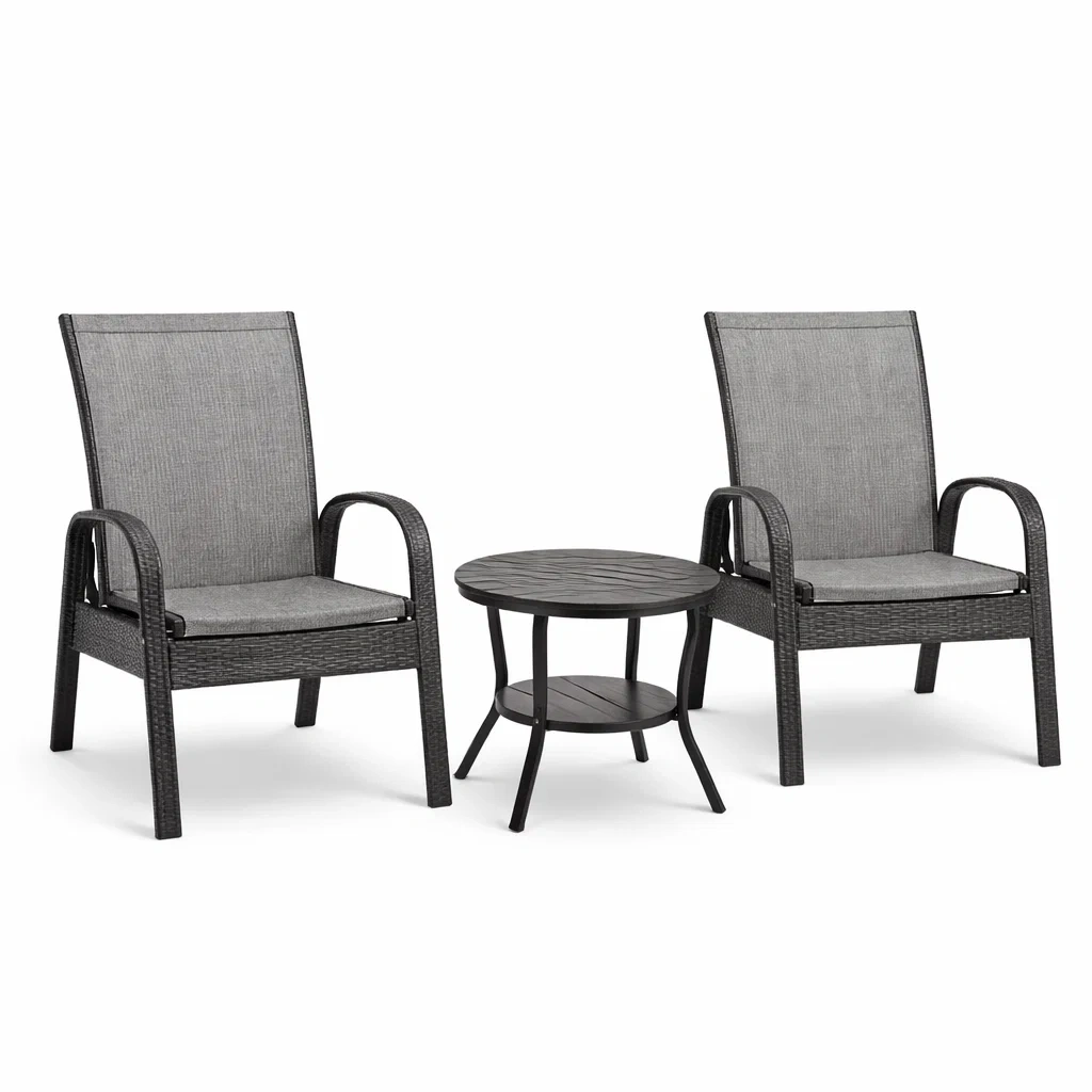 2 chaises avec cadre en acier et assise en textilène, 1 table en résine tressée.