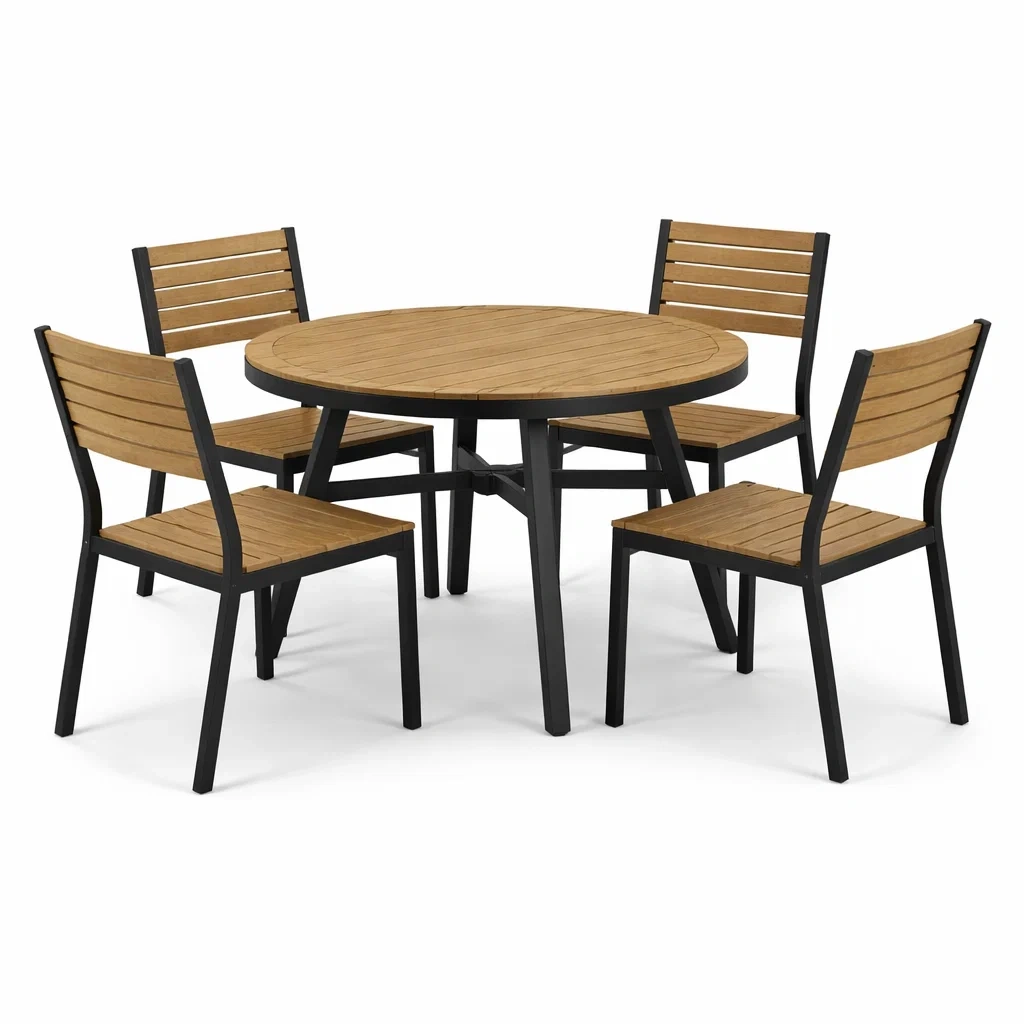 Ensemble de meubles comprenant une table et quatre chaises pour usage extérieur. Le plateau de la table et les assises des chaises sont en bois d'acacia, tandis que la structure est en aluminium robuste. Chaque chaise a une capacité de charge de 120 kg. La table a un diamètre de 100 cm et une hauteur de 75 cm. Les chaises ont une hauteur de 90 cm, une largeur de 45 cm et une profondeur de 55 cm.