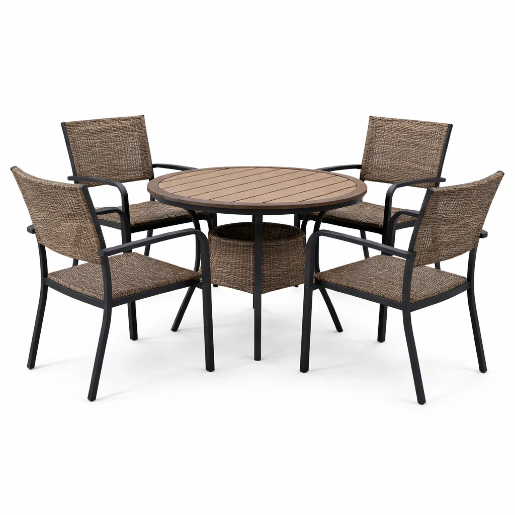 Matériaux : Table en bois composite, chaises en résine tressée, pieds de table et cadre en acier.